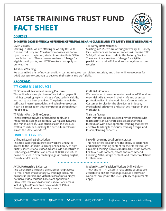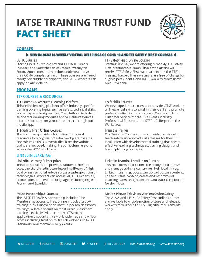 The IATSE TTF Fact Sheet is a snapshot of the key programs available to local unions and IATSE workers.